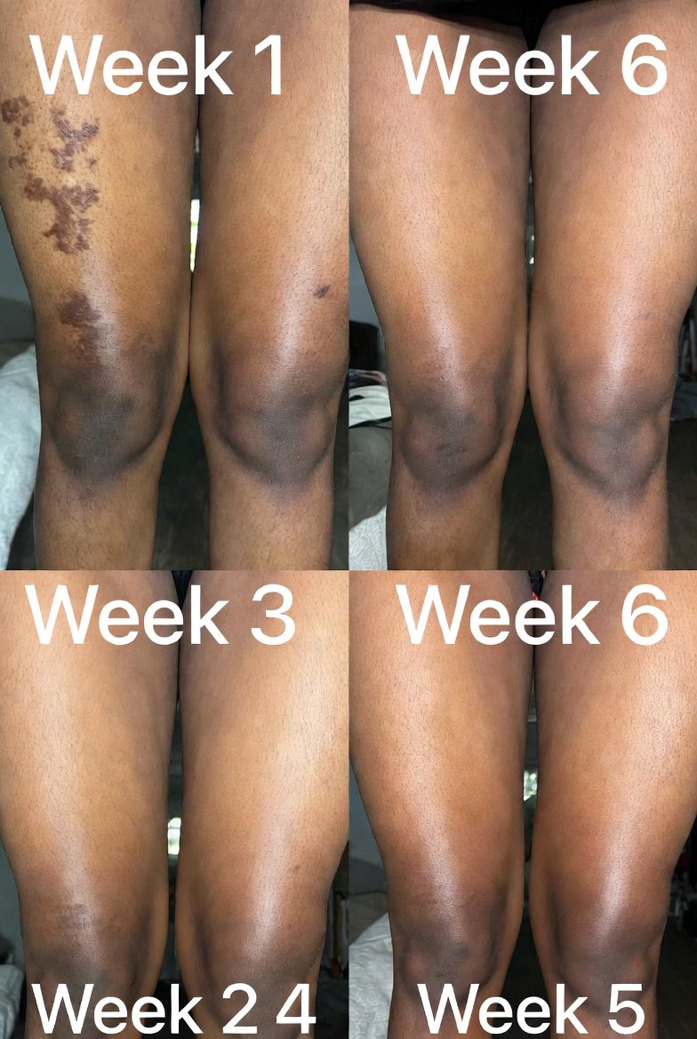 Started with typical winter issues: ashy legs, darker knees/elbows, and some arm spots from old scars. Applied twice daily after showering, always with sunscreen on exposed skin.