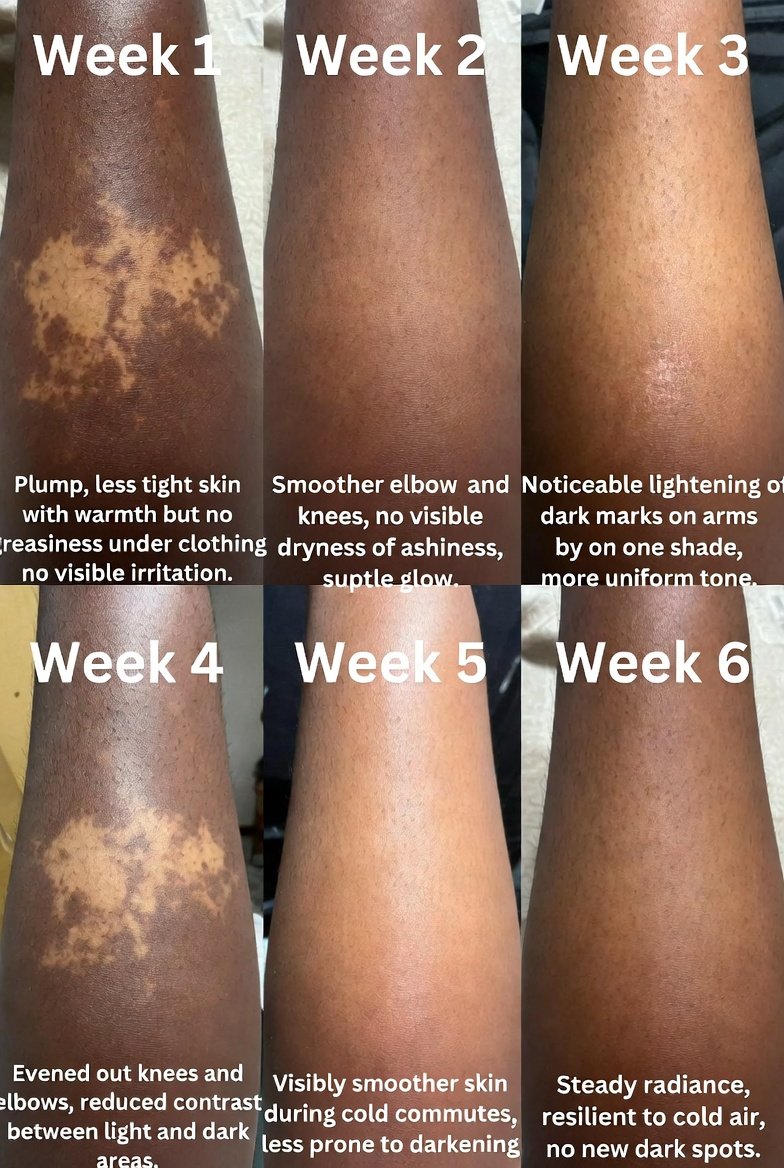 • Weeks 5 6: Spots faded noticeably (1 shade on arms), contrast on knees/elbows reduced. Skin stayed resilient in cold commutes no cracking or new dullness.